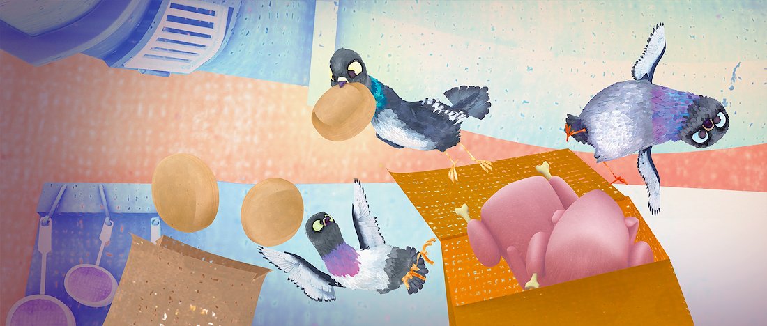 A Belfast pigeon named Eileen goes in blind pursuit of some grub in a drive-thru restaurant, comically protected by fellow biddies, Maggie and Esther, in her perilous endeavour.
